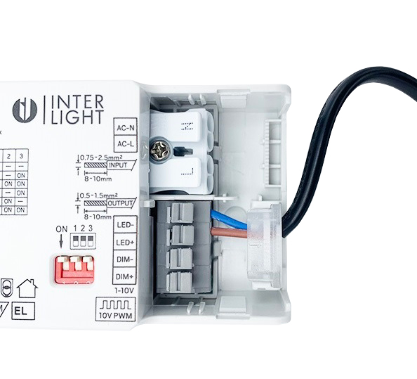 Interlight IL-X2D15-1-10 LED driver 160-350mA dimbaar 1-10V instelbaar d.m.v. dipswitches 160mA 2,24-6,72W, 180mA 2,52-7,56W, 220mA 3,08-9,24W, 280mA 3,92-11,76W, 320mA 4,48-13,44W, 350mA 4,9-14,7W