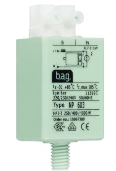 Bag 10067389 NP 603 ontsteker parallel (2 draads) 0,7kV - 1kV Ontsteker voor leidinglengte > 1,5m voor metaal halogeenlampen (HPI ) van 250W en 400W Let op lage ontsteekspanning voor Osram SI en Philips HPI-T Plus lampen, 2 draads ontsteker