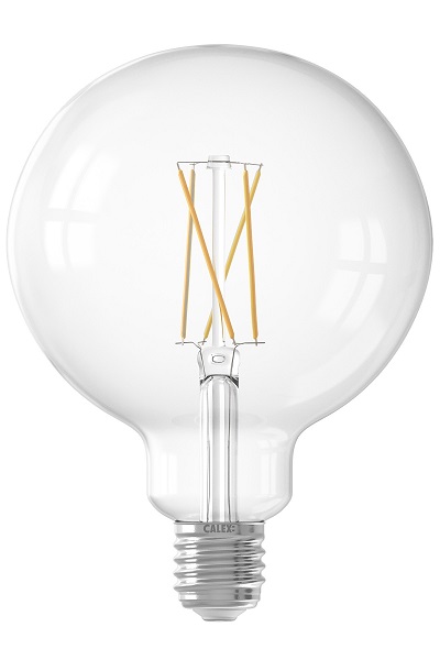 Calex Smart filament LED globelamp 125mm 7,5W E27 220V-240V 3000K-1800K kleur 830-818 helder dimbaar Dim to warm, kleurtemperatuur verschuift van warmwit (3000K) naar zeer warmwit (1800K) bij volledig dimmen. Bestuurbaar en dimbaar via Wifi met de gratis Calex App
